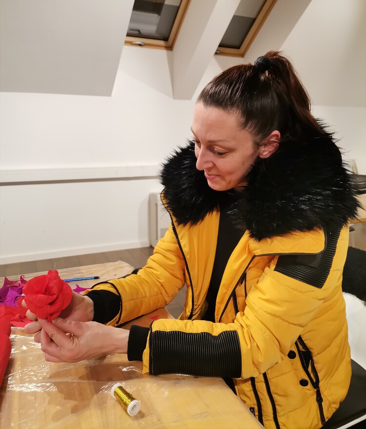 Sudionici radionice pažljivo su promatrali rad gđe Đurđice te su se odlučili za izradu ružica (rožica) i lančića od krep papira.