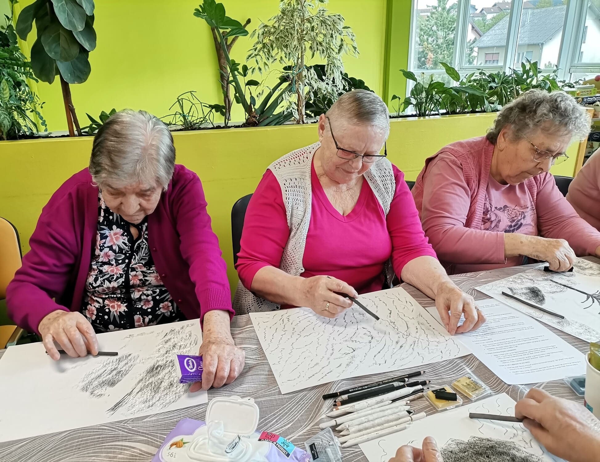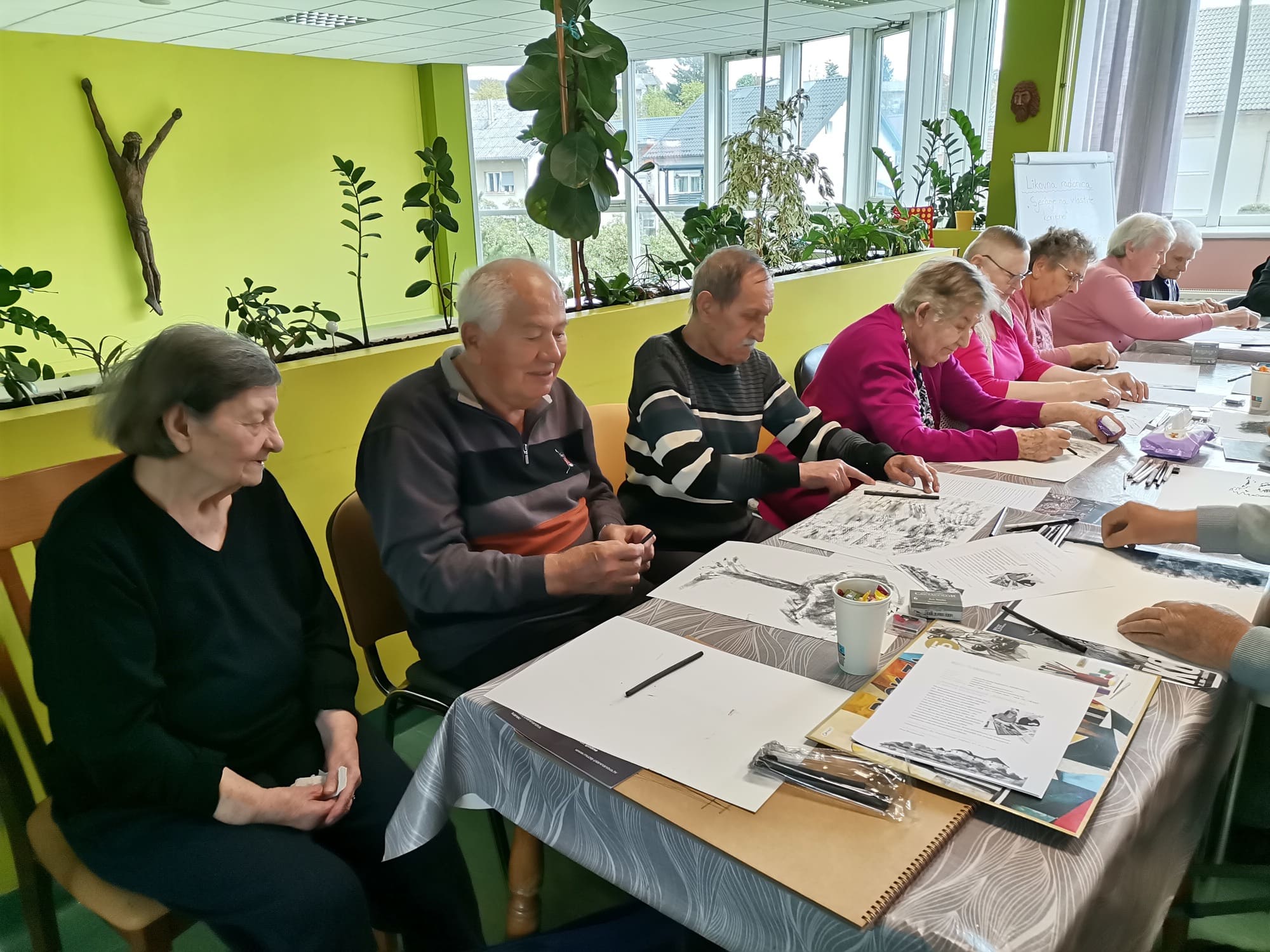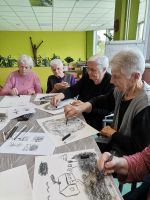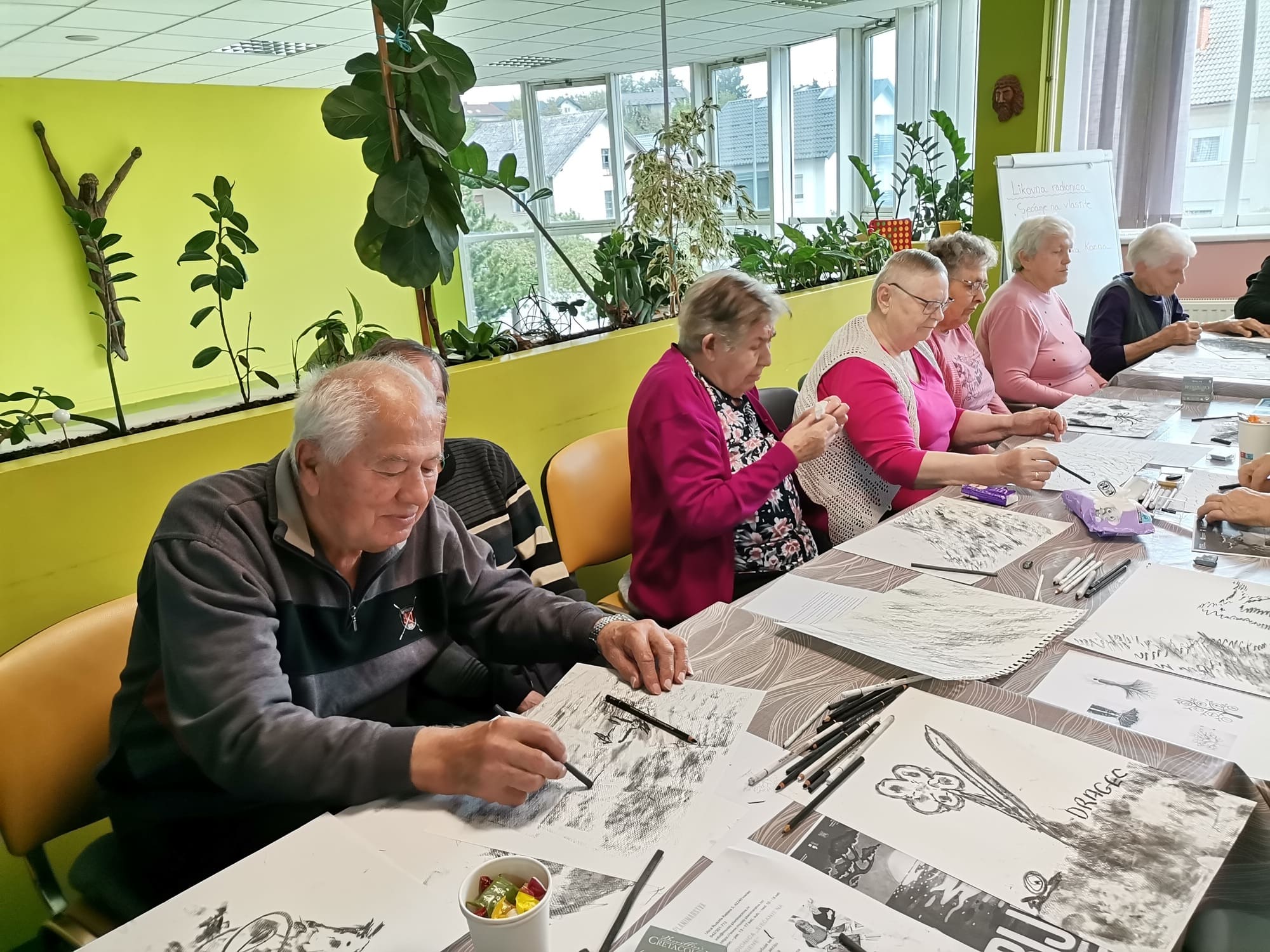 Voditeljica Nevenka Kozina s puno je pažnje upućivala polaznike u tehnike rada s ugljenom koji se pokazao kao izvrstan odabir za navedenu temu. Naime, ugljen za crtanje dobiva se procesom sagorijevanja drveta, stoga je bio idealan za prikaz korijena odnosno vlastitog podrijetla.
