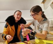 Sudionici radionice pažljivo su promatrali rad gđe Đurđice te su se odlučili za izradu ružica (rožica) i lančića od krep papira.