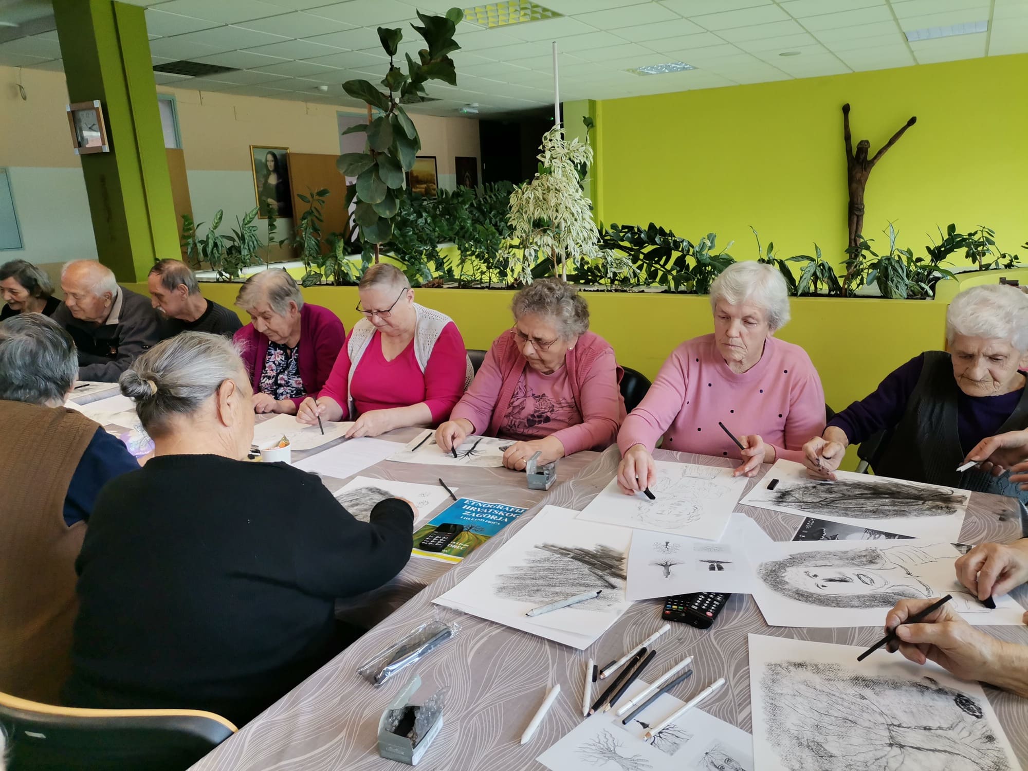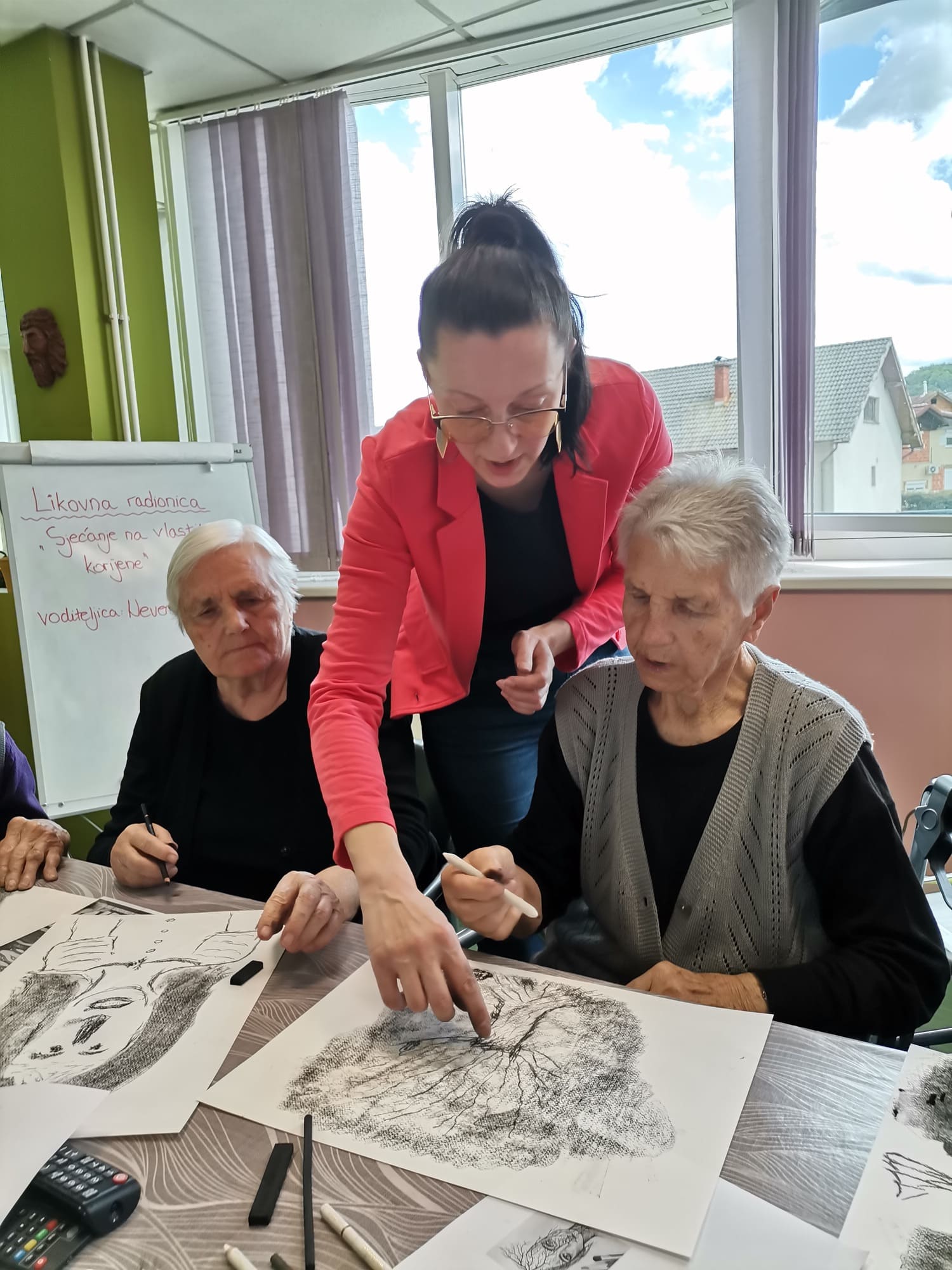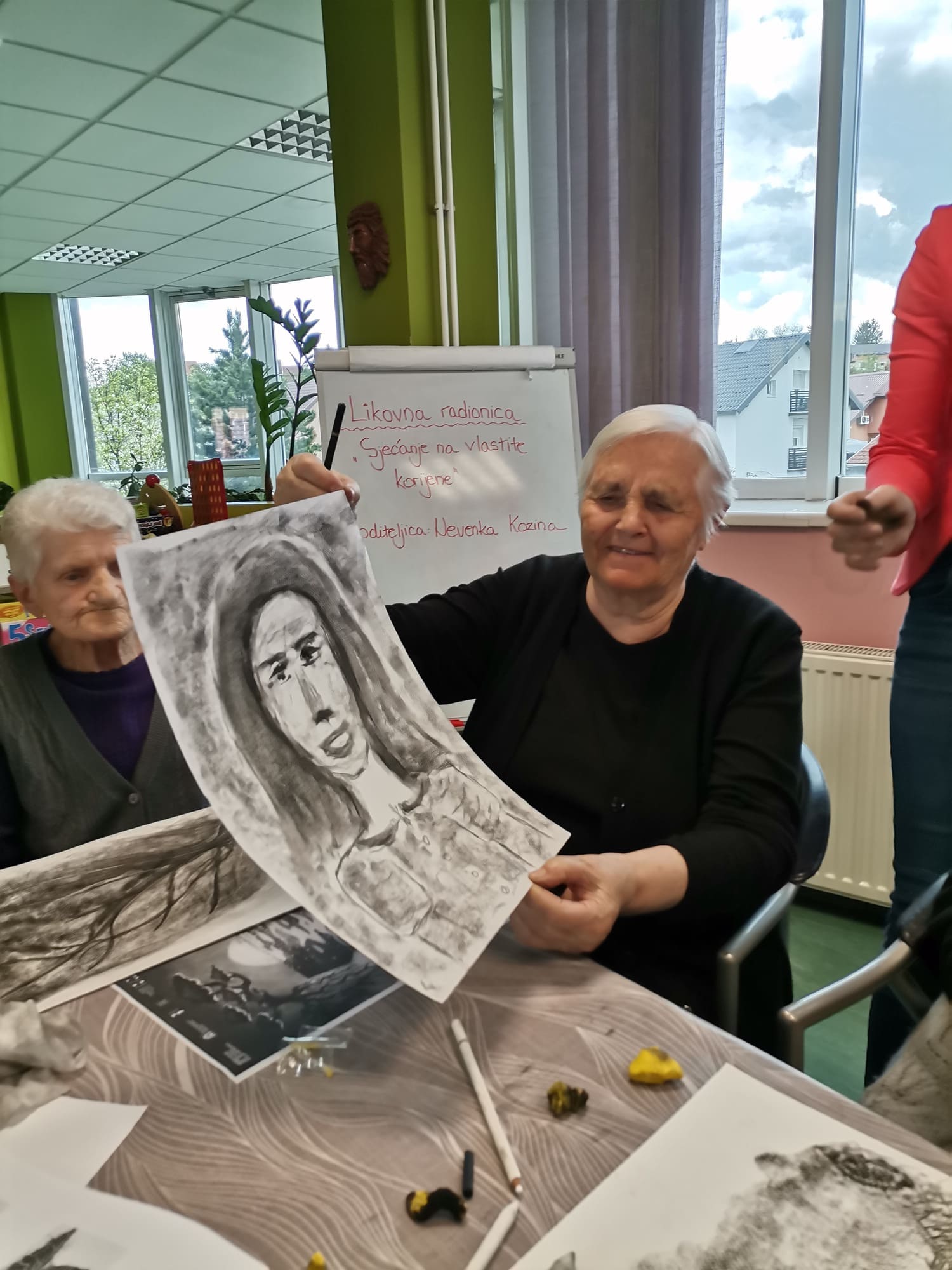 Voditeljica Nevenka Kozina s puno je pažnje upućivala polaznike u tehnike rada s ugljenom koji se pokazao kao izvrstan odabir za navedenu temu. Naime, ugljen za crtanje dobiva se procesom sagorijevanja drveta, stoga je bio idealan za prikaz korijena odnosno vlastitog podrijetla.