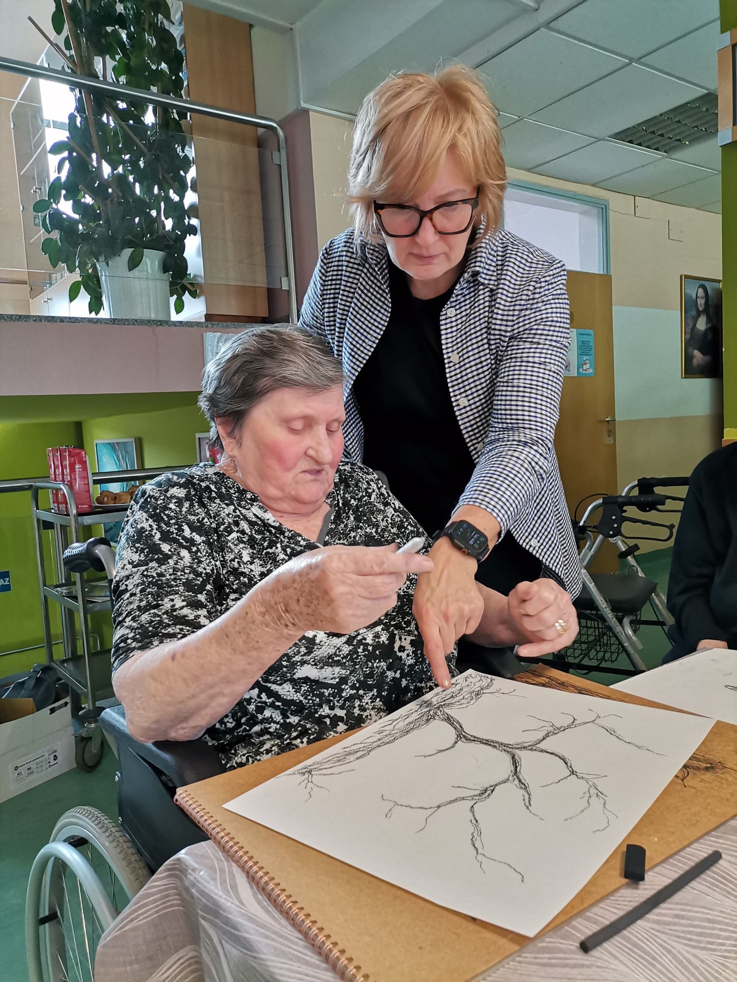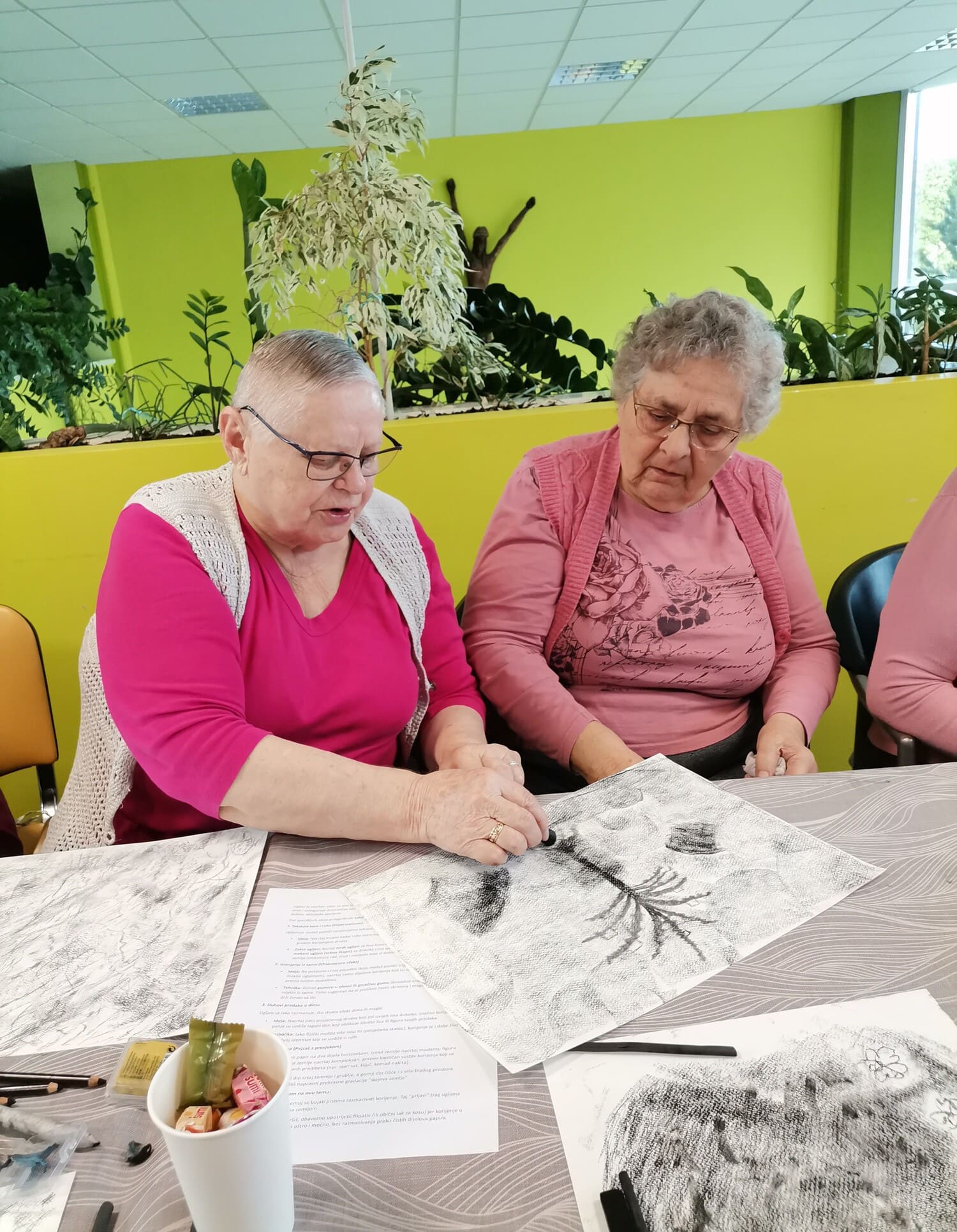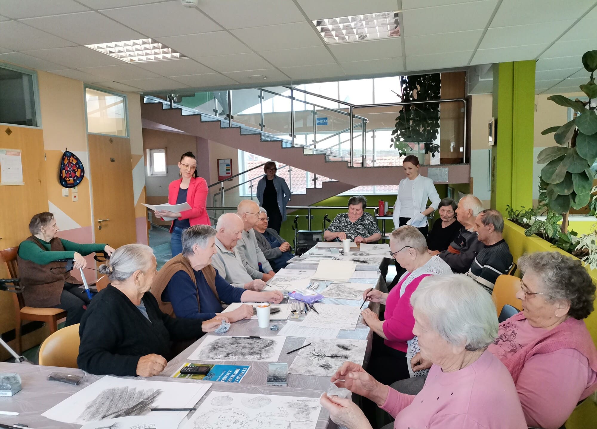 Voditeljica Nevenka Kozina s puno je pažnje upućivala polaznike u tehnike rada s ugljenom koji se pokazao kao izvrstan odabir za navedenu temu. Naime, ugljen za crtanje dobiva se procesom sagorijevanja drveta, stoga je bio idealan za prikaz korijena odnosno vlastitog podrijetla.